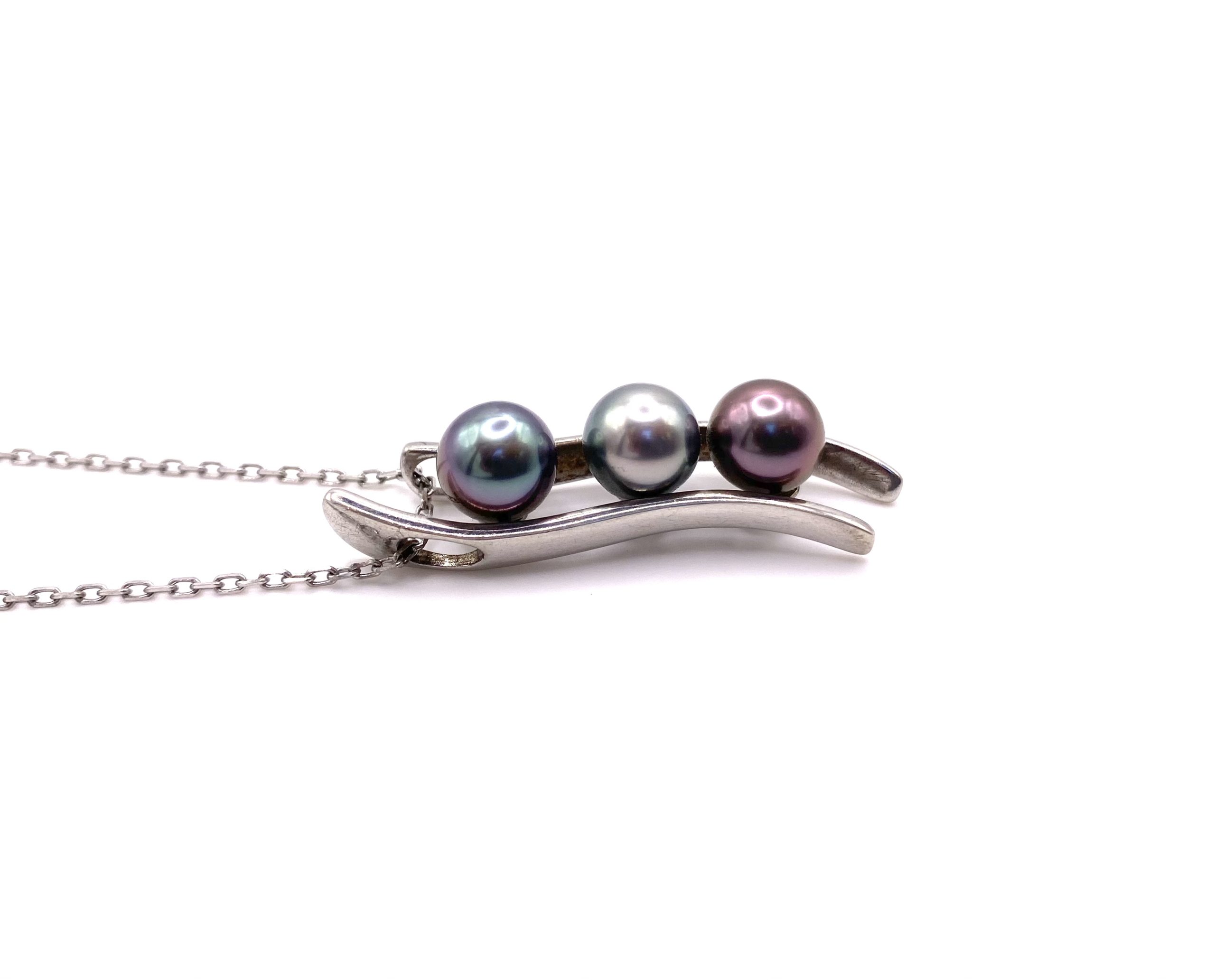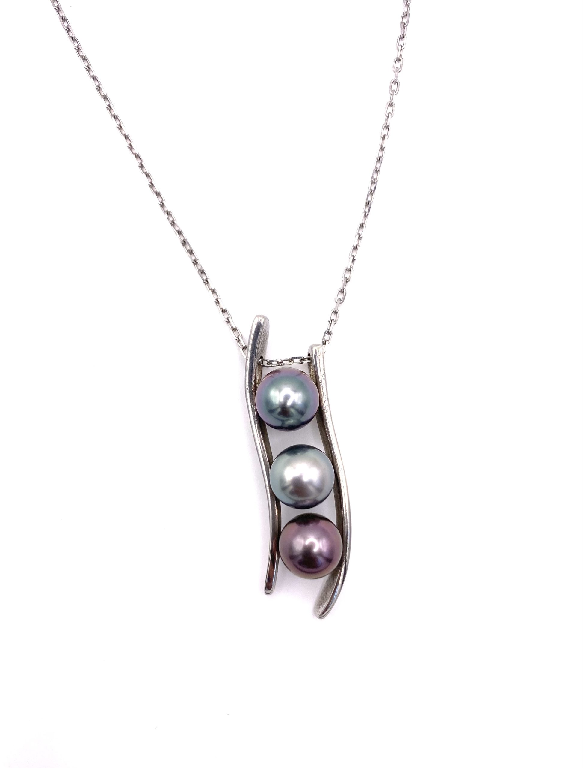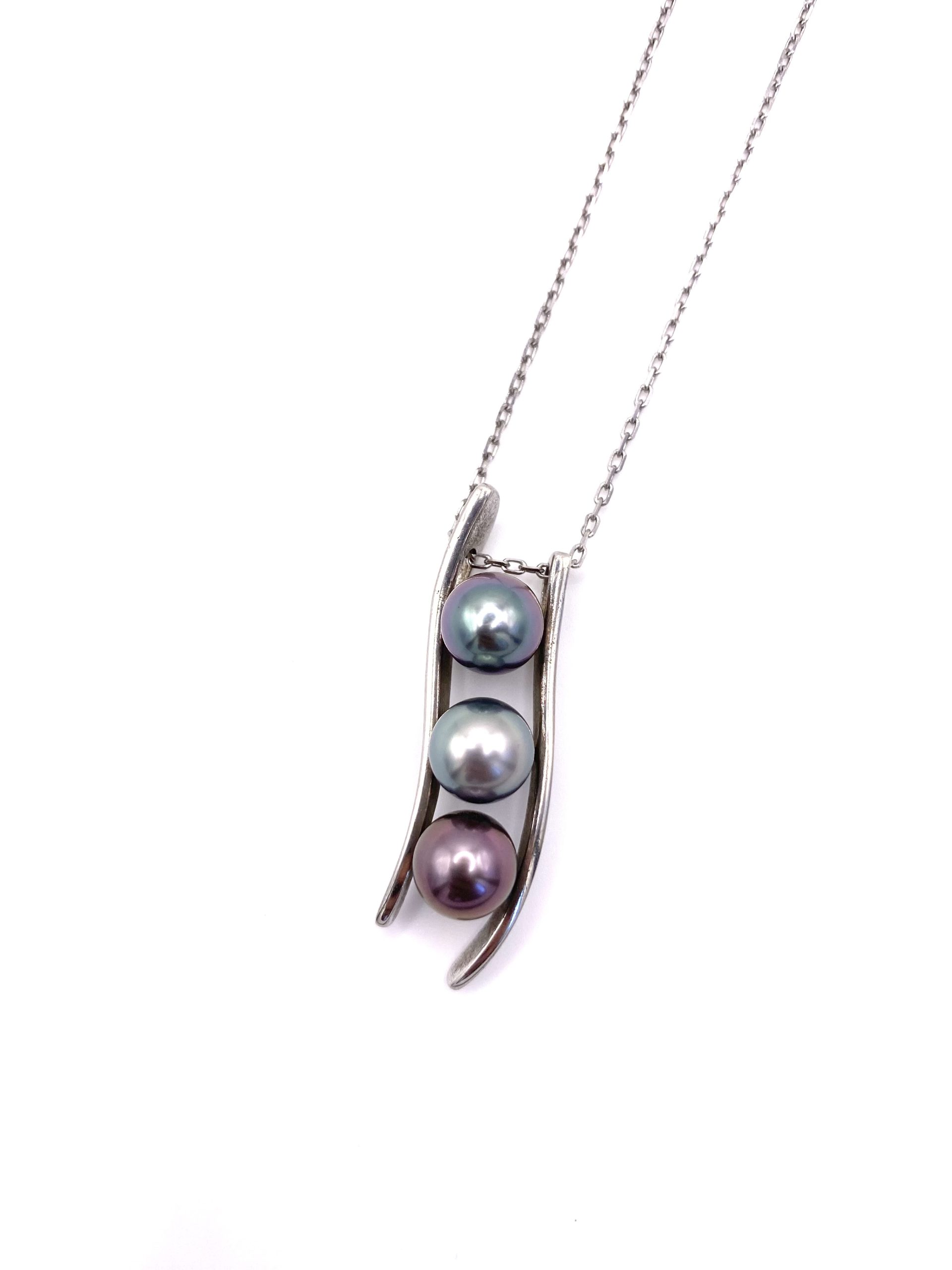Collier Ondulés parallèles en argent 925/000 rhodié avec 3 Perles de Tahiti