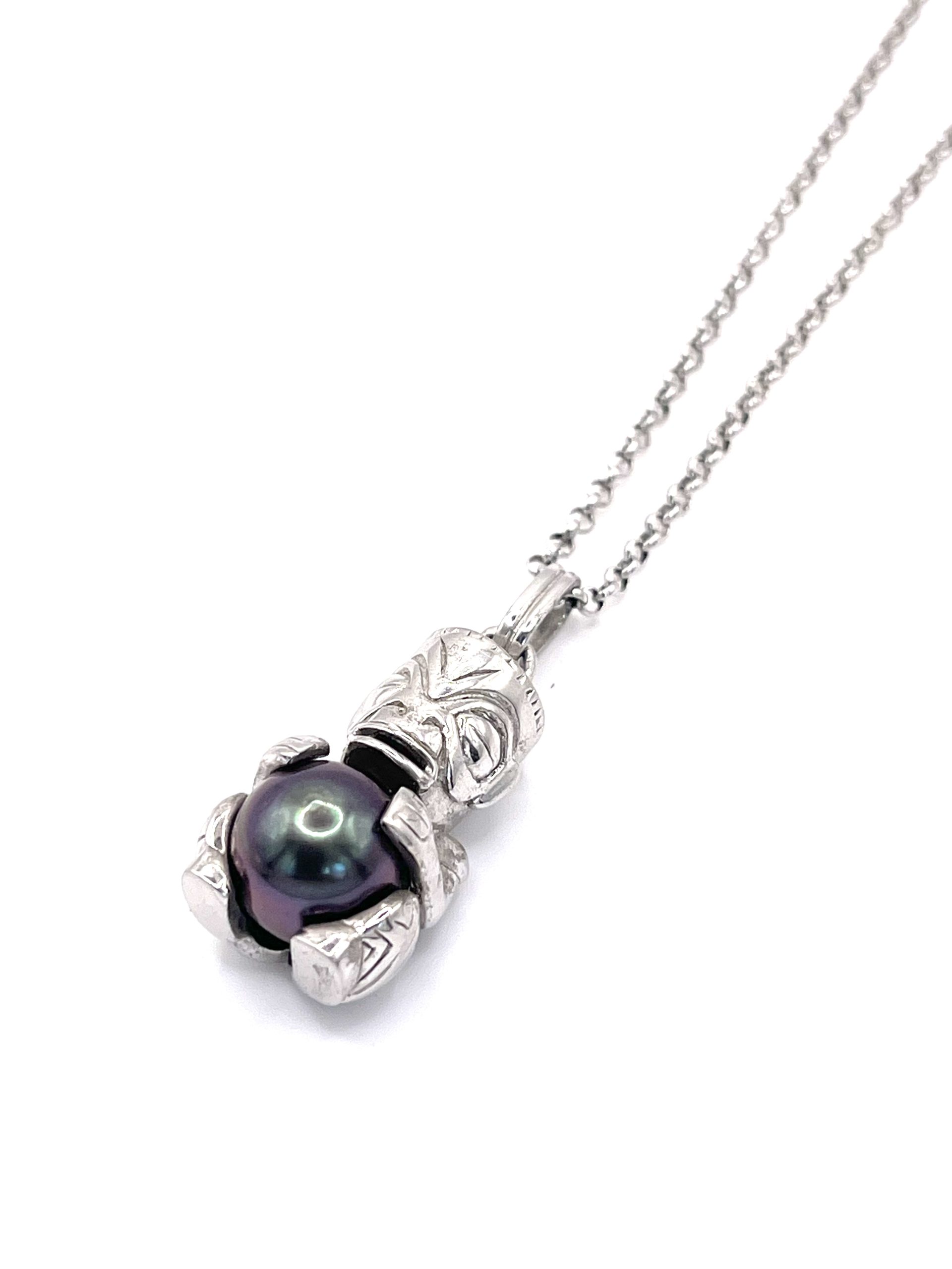 • Collier Tiki avec les fesses tatouées en argent 925/000 rhodié avec une Perle de Tahiti